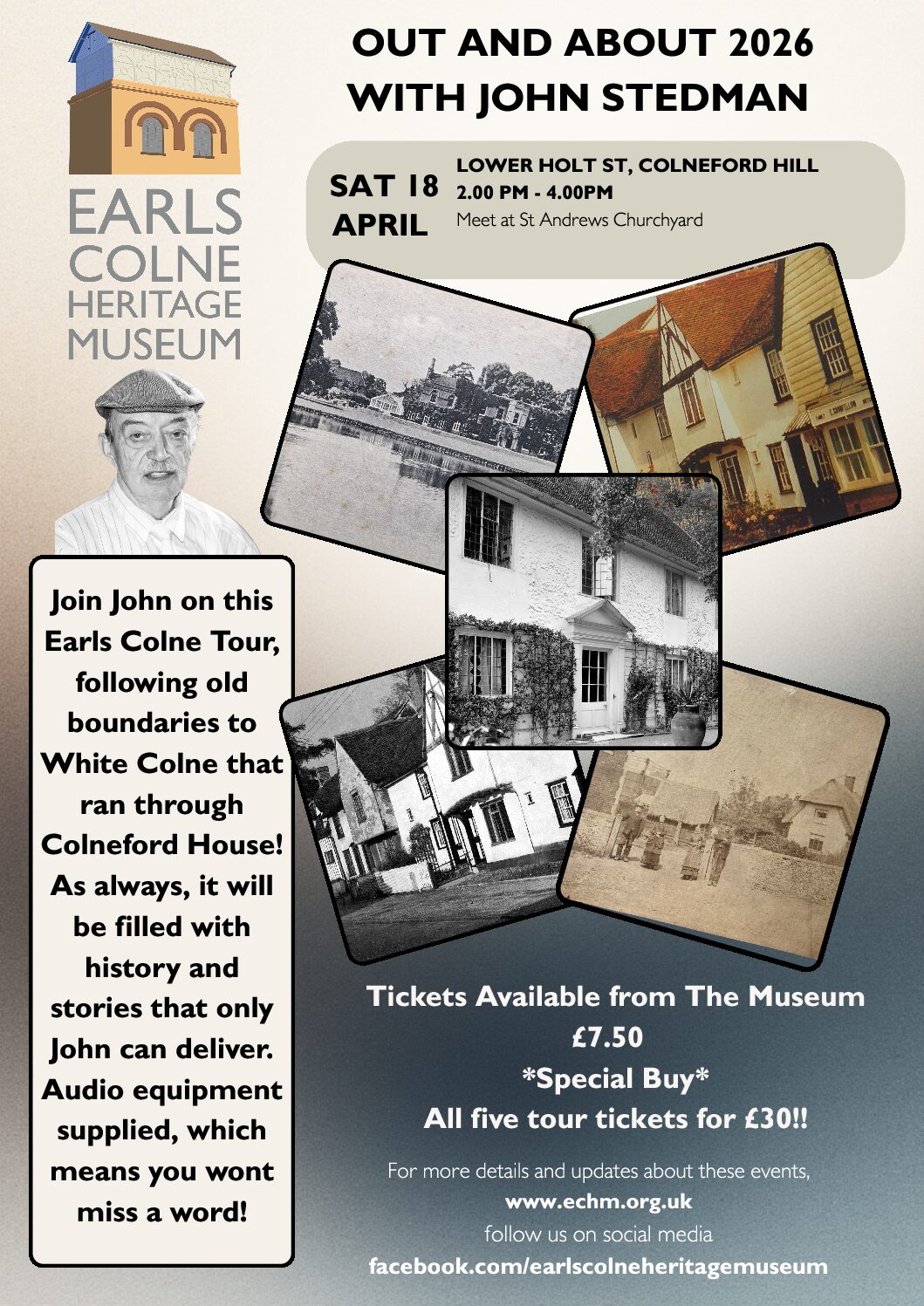 The first of this year’s ”OUT AND ABOUT’ tours with John Stedman. Join John on this tour of Lower Holt Street and Colneford Hill.  Parish boundaries have changed over time, the boundary between Earls Colne and White Colne once ran through Colneford House. Lots to talk about on this tour, houses, shops, pubs, hidden history.